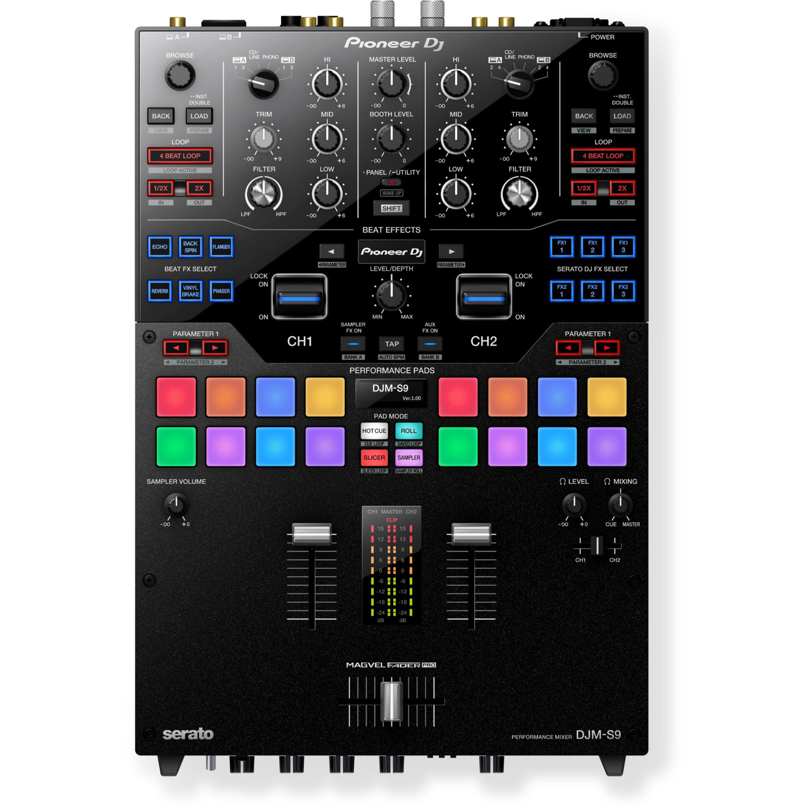 המיקסר DJM-S9 כולל פדים ביצועיים עם תכנון מדויק המאפשר תגובה מהירה. באפשרותכם לעשות שימוש ב-16 הפדים הצבעוניים – שמונה בכל צד – על מנת לעורר ולהפעיל מאפיינים כולל Hot Cue, Roll, Slicer וגם Loop. או לבחור להתאים ולחבר את הפדים לפונקציות אחרות בתוכנת Serato DJ. מסך ה- EL האורגני מציג את המצב הפעיל ונמצא בשימוש, ובאפשרותכם להקצות צבעי פדים ל-Hot Cues בתוכנת Serato DJ להשגת Cue חזותי אף חזק יותר.